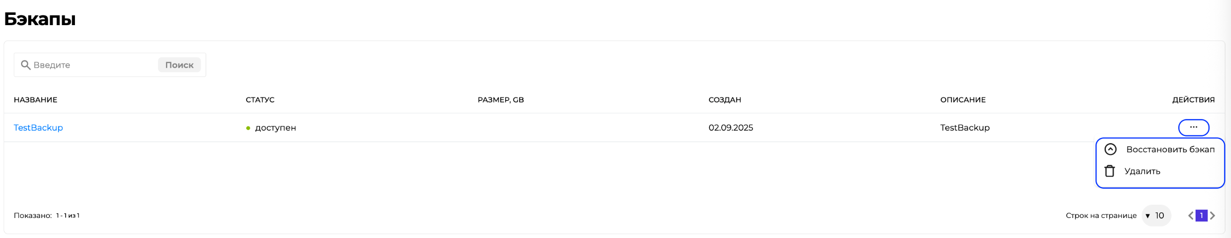 Полное удаление конкретной резервной копии без возможности восстановления. Перед удалением рекомендуется убедиться, что существуют актуальные копии данных. |