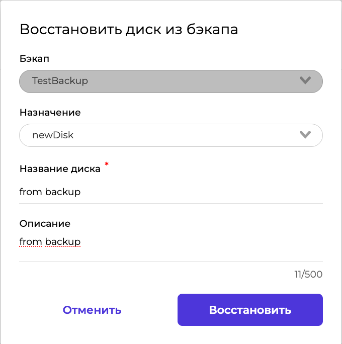 Новый диск: Означает что после нажатия кнопки «Восстановить» будет создан новый диск с заполненый данными из бэкапа |