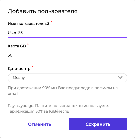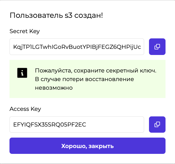 - На вкладке «Объектное хранилище S3» выберите категорию «Создать»
