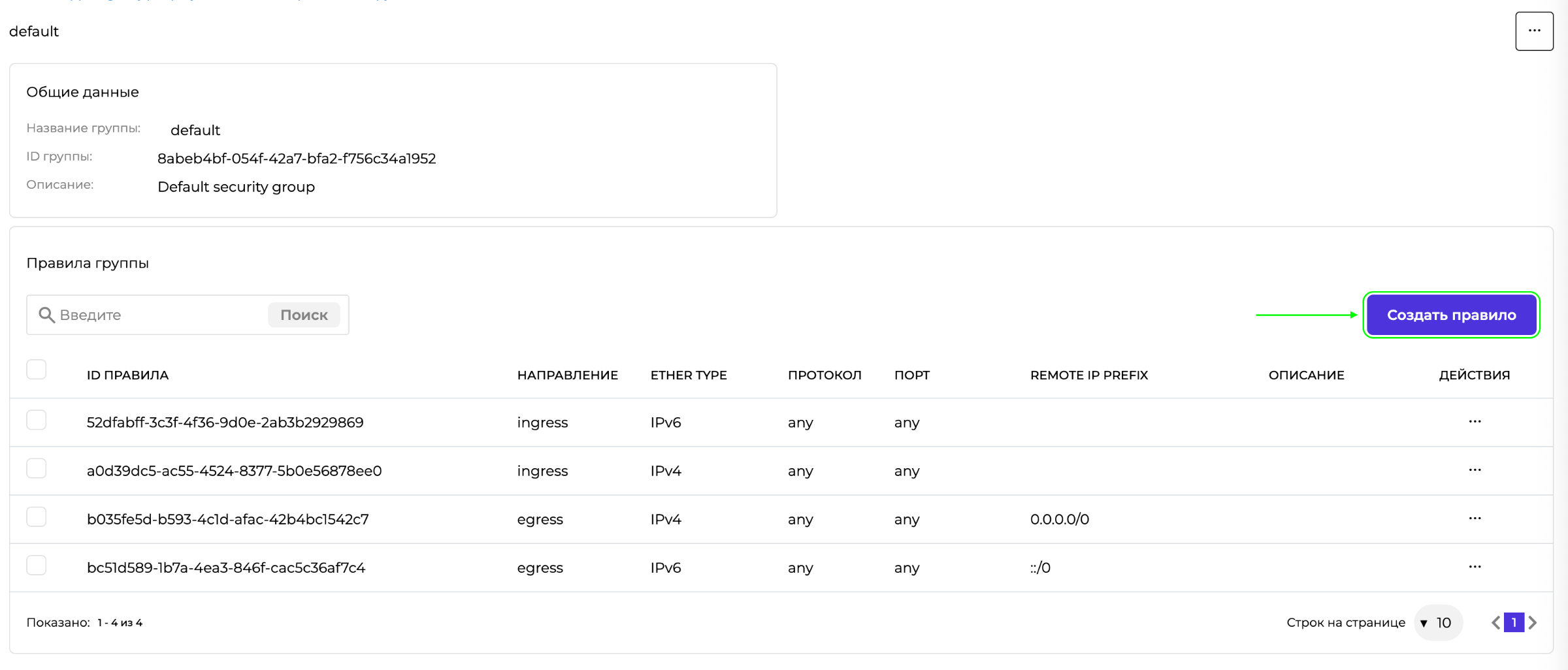 На вкладке «Сетевые ресурсы» откройте вкладку «Группы безопасности» и выберите подходящую группу и зайдите в нее: