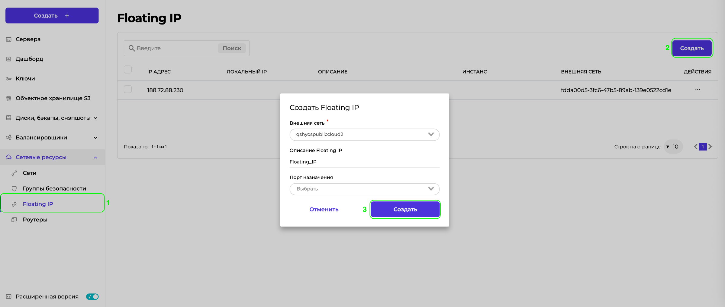 На вкладке «Сетевые ресурсы» откройте вкладку «Floating IP» и выберите категорию «Создать» .